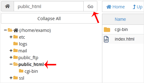 3. No Gerenciador de arquivos cPanel, navegue até o diretório para o qual deseja enviar seus arquivos. Por exemplo, se desejar enviar seus arquivos para o diretório HTML público, você deve primeiro ir para /public_html. No lado esquerdo, na lista de diretórios, clique duas vezes no diretório "public_html".