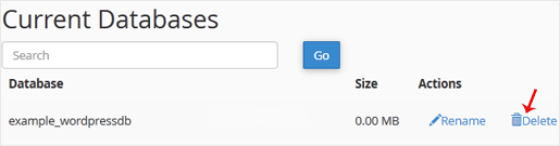 3. Abaixo de "Current Databases", você pode ver uma lista de todos os seus bancos de dados. Localize o banco de dados que deseja remover e clique em "Delete".