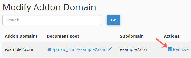 3. Localize o domínio do complemento em "Modify Addon Domain" e clique em "Remove".
