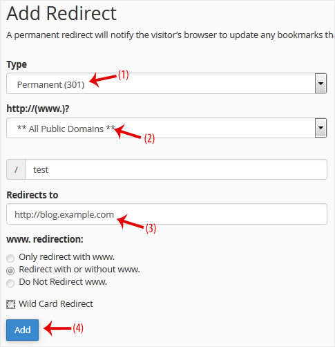 3. Abaixo de "Add Redirect", você deve inserir os seguintes detalhes e escolher as opções apropriadas.