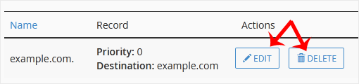 5. Localize o registro CNAME que deseja editar ou remover. Caso deseje editar um registro CNAME, clique em "Edi"t. Modifique os detalhes e clique em "Save Record". A remoção de um registro pode ser feita com a opção "Delete".