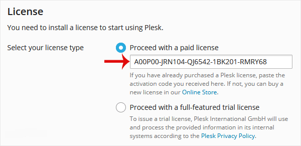 Passo 4: Na seção Licença, se você tiver uma chave de licença, digite sua chave de licença Plesk Onyx ou use uma licença de teste selecionando a "full-featured trial license".