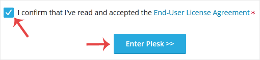 Último passo: Role até o final da página, leia e aceite o Contrato de licença do usuário final. Clique em "Enter Plesk".